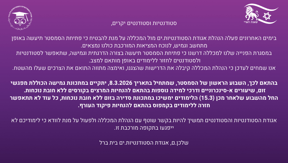 בשבוע הראשון של הסמסטר, החל מתאריך 8.3.2026, הלימודים יתקיימו במתכונת גמישה הכוללת מפגשי זום, שיעורים א סינכרוניים ודרכי למידה נוספות. בנוסף, בהתאם להנחיות המרצים בקורסים, לא תחול חובת נוכחות.